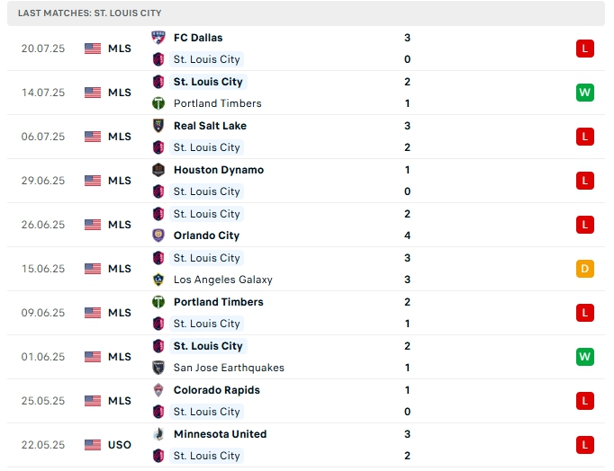 St. Louis City SC ở vòng đấu gần nhất họ có chiến thắng trước FC Dallas, đây là thất bại thứ 4 của họ ở 5 trận gần nhất, St. Louis City SC có được 18 điểm và đang xếp vị trí thứ 14 trên BXH, phong độ thời gian qua của St. Louis City SC là không tốt, thậm chí là tệ, khi đội bóng này chỉ có được 2 chiến thắng ở 10 trận gần nhất, trong đó có 7 thất bại cùng 1 hòa, dù vậy trên sân nhà của mình St. Louis City SC đang cho thấy sự tiến bộ với 2 chiến thắng, 2 hòa và chỉ 1 thất bại sau 5 trận đấu.