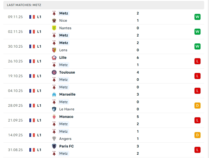 Metz sau 12 trận đấu hàng công đội bóng này chơi tốt với 12 bàn thắng có được bên cạnh hàng thủ thiếu chắc chắn khi nhận đến 27 bàn thua, 3/5 trận vừa qua khép lại từ 3 bàn thắng trở lên, khi thi đấu xa nhà ở 4/5 trận gần nhất khép lại trên 3 bàn.
