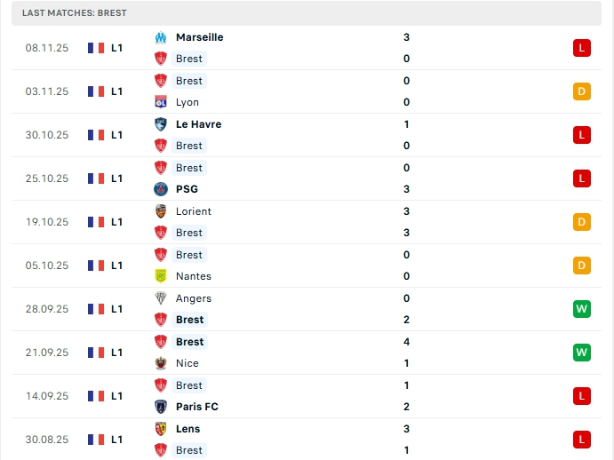 Stade Brestois sau 12 trận đấu họ có được 2 chiến thắng, 4 hòa và 6 thất bại, mang về 10 điểm và đang xếp ở vị trí thứ 15 trên BXH, phong độ thời gian qua của Stade Brestois là không tốt khi họ không thắng ở 6 trận liên tiếp gần nhất, trong đó có đến 3 thất bại cùng 3 hòa, trên sân nhà của mình Stade Brestois cũng chỉ thắng 1 ở 5 trận gần nhất với 2 hòa cùng 2 thất bại.