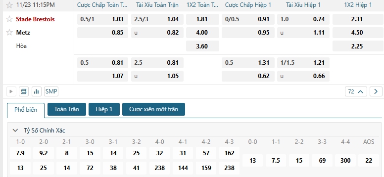 Bảng tỷ lệ kèo bóng đá trận đấu Stade Brestois vs Metz