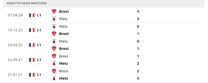 Lịch sử đối đầu của Stade Brestois vs Metz