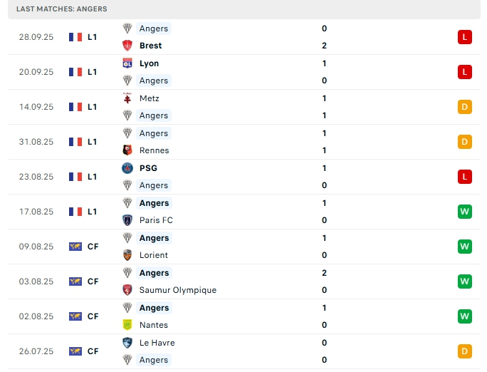 Bên kia sân, Angers ở vòng đấu gần nhất họ nhận thất bại 0-2 trước Brest, đây là trận không thắng thứ 5 liên tiếp, trong đó có 2 hòa và 3 thất bại, sau 6 trận đấu Angers mang về 1 chiến thắng, 2 hòa cùng 3 thất bại, có được 5 điểm và đang xếp vị trí thứ 17 trên BXH, phong độ thời gian qua của Angers là không tốt, đội bóng này không thắng ở 5 vòng gần nhất, khi thi đấu xa nhà Angers chơi cực tệ với 2 hòa cùng 2 thất bại ở 4 trận gần nhất.