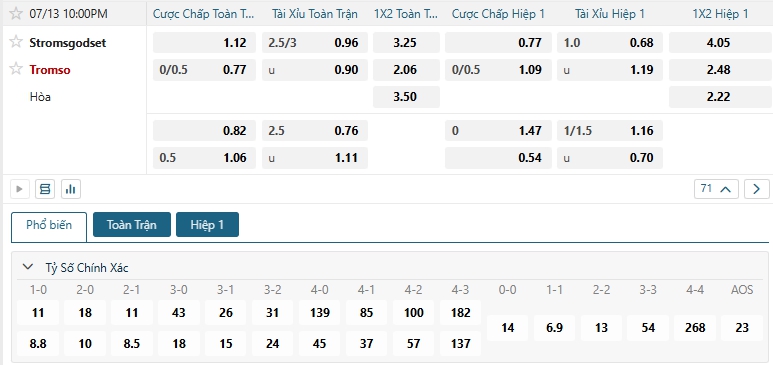 Nhà cái Châu Á đang đánh giá khả năng chiến thắng của các vị khách Tromso cao hơn so với chủ nhà Stromsgodset qua mức chấp đang là 0.25, việc các cầu thủ chủ nhà đang chơi cực tệ trái ngược hoàn toàn với phong độ của các vị khách là cơ hội để Tromso tiếp tục tìm kiếm chiến thắng và duy trì vị thế trong top đầu, lựa chọn Tromso cho kèo Châu Á.