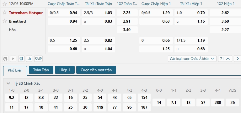 Bảng tỷ lệ kèo bóng đá trận đấu Tottenham vs Brentford
