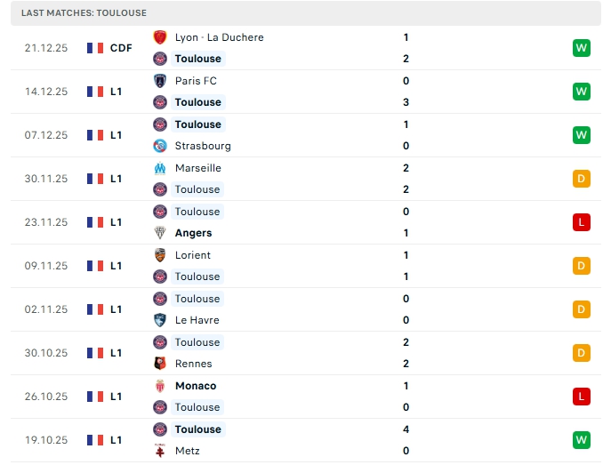 Toulouse sau 16 vòng đấu, đội bóng này mang về 6 chiến thắng, 5 hòa cùng 5 thất bại, có được 23 điểm và đang xếp vị trí thứ 8 trên BXH, ở vòng đấu gần nhất Toulouse có chiến thắng 3-0 trước Paris FC, trận thắng này trận bất bại thứ 4 liên tiếp, trong đó có 3 chiến thắng, trên sân nhà ở 5 trận gần nhất Toulouse thắng 2 hòa 2 và thua 1 sau 5 trận đấu.