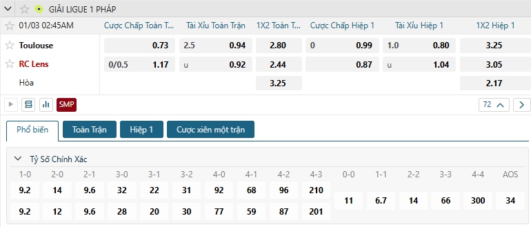 Bảng tỷ lệ kèo bóng đá trận đấu Toulouse vs Lens