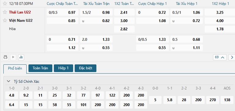 Bảng tỷ lệ kèo bóng đá trận đấu U22 Thái Lan vs U22 Việt Nam