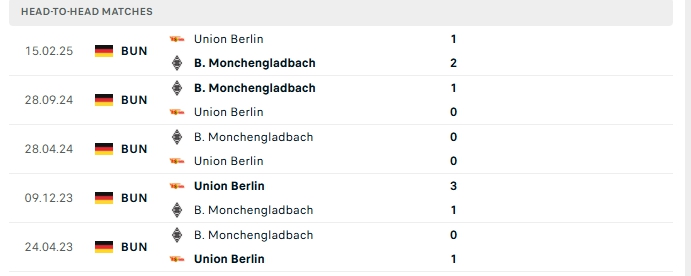 Lịch sử đối đầu của Union Berlin vs Monchengladbach