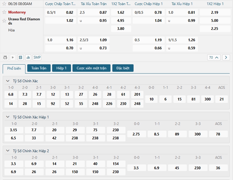 Bảng tỷ lệ kèo bóng đá trận đấu Urawa Red vs Monterrey
