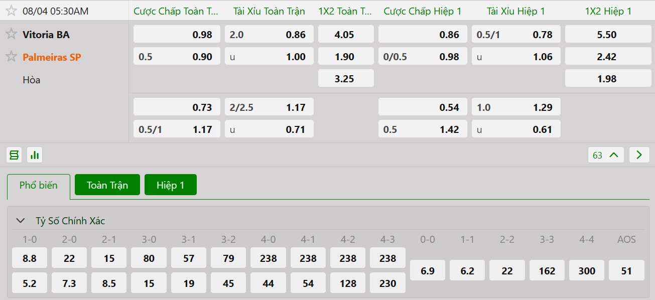 Bảng tỷ lệ kèo bóng đá trận đấu Vitoria vs Palmeiras