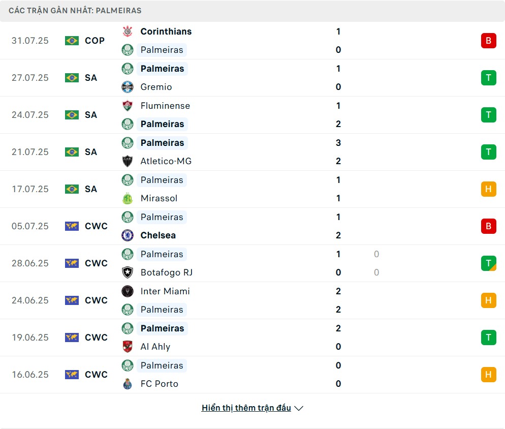 Bên kia chiến tuyến, Palmeiras đang thể hiện bản lĩnh của một đội bóng lớn. Sau 15 vòng, họ đã thu về 10 chiến thắng, 2 trận hòa và chỉ để thua 3 lần. Với 32 điểm trong tay, đại diện bang Sao Paulo đang vững vàng trong top 3, đồng thời còn vừa lọt vào tứ kết FIFA Club World Cup. Ngoài cú sảy chân đáng tiếc trước Corinthians ở cúp Quốc gia, các học trò HLV Abel Ferreira vẫn cho thấy sự ổn định đáng nể khi bất bại 4 vòng gần nhất tại giải VĐQG – trong đó có tới 3 chiến thắng.