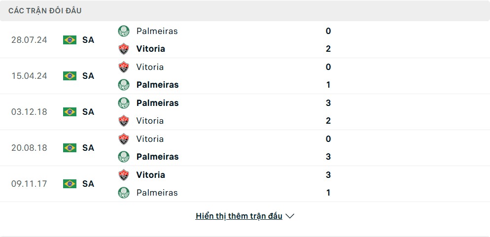 Lịch sử đối đầu của Vitoria vs Palmeiras