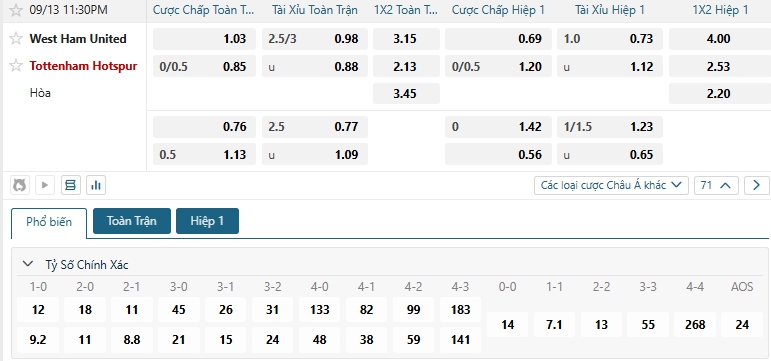 Bảng tỷ lệ kèo bóng đá trận đấu West Ham Utd vs Tottenham