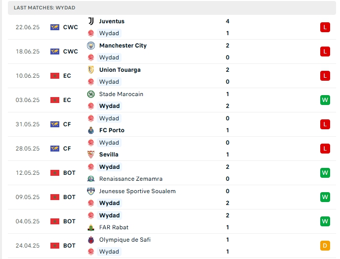 Wydad Casablanca sau 2 lượt trận họ chưa có điểm số nào, ở trận ra quân Wydad Casablanca nhận thất bại 0-2 trước Man City và ở trận thứ 2 họ nhận thất bại đậm 1-4 trước Juventus, chưa có điểm số nào Wydad Casablanca đang xếp thứ 3 trên BXH và chính thức bị loại..