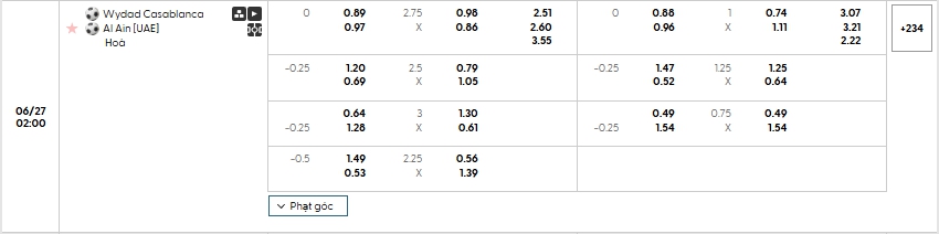 Bảng tỷ lệ kèo bóng đá trận đấu Wydad Casablanca vs Al Ain